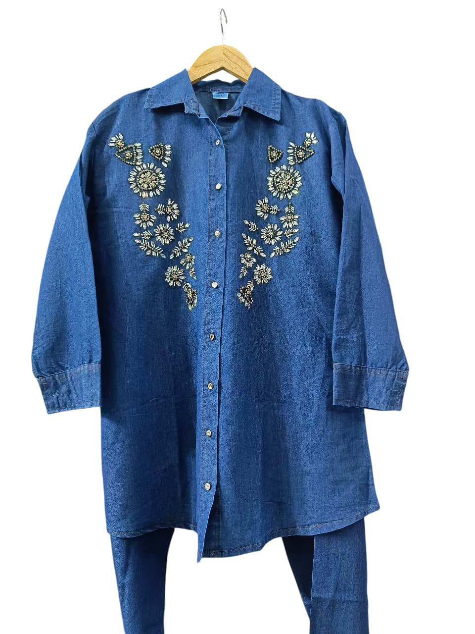 This Dark Blue Denim Kurti with Floral Embroidery is a timeless fusion of comfort and style. Crafted from premium quality soft denim, it offers a relaxed yet structured fit that flatters all body shapes. The highlight of this piece is the intricate golden floral embroidery placed symmetrically on the front, giving it a luxurious, handcrafted appeal. The collared neckline and front button closure lend a modern shirt-style look, while the long sleeves make it versatile for year-round wear. Whether paired with denim trousers for a coordinated set, leggings for a casual day out, or statement palazzos for a fusion look, this kurti is a wardrobe essential. Ideal for casual outings, office wear, and semi-formal gatherings, it blends everyday practicality with ethnic elegance.